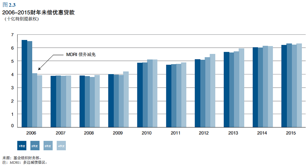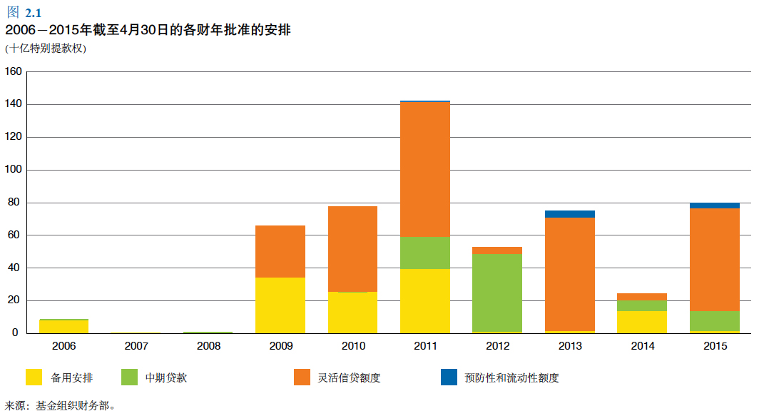 عربي 中文 Français 日本語 Русский Español Section Notes 贷款 非优惠融资活动 优惠融资活动 规划设计 政策支持工具 基金组织的贷款旨在帮助成员国解决国际收支问题、稳定 其经济及恢复可持续经济增长。这一危机化解职责处于 基金组织贷款的核心。同时,最近的全球金融危机突出表 明,需要建立有效的全球金融安全网,帮助各国应对不利 冲击。因此,近期贷款改革增添了新的危机防范工具,对 基金组织传统的危机化解职责起到补充。与开发银行不 同,基金组织不为特定的项目提供融资。 总的来说,基金组织有两类贷款,一是按非优惠利率提供 的资金,二是以优惠条件(低息或无息)向最贫穷的国家 提供的贷款。 回到顶端 非优惠融资活动 2015 财年,执董会批准了基金组织非优惠融资 工具下的九项安排,共计800 亿特别提款权(不 剔除取消的安排,按2015 年4 月30 日特别提 款权/ 美元汇率0.71103 折算,为1120 亿美元) (见表2.1)。灵活信贷额度(FCL)以及预 防性和流动性额度(PLL)下的六项预防性安 排占这些贷款承诺的84% 以上,其中包括对墨 西哥的贷款限额为470 亿特别提款权(670 亿 美元)的FCL。批准的对墨西哥和波兰的两项 FCL 安排以及对摩洛哥的PLL 安排是之前到期 安排的后续安排。剩下的三项预防性安排是对 洪都拉斯、肯尼亚和塞尔维亚共和国的备用安 排,共计14 亿特别提款权(19 亿美元),在 规划批准时被当局视为预防性的安排。此外, 执董会在中期贷款(EFF)下批准了对乌克兰 的延期安排,特别贷款限额为123.48 亿特别提 款权(175 亿美元),以支持当局的调整规划。 截至2015 年4 月底,普通资金账户融资安排 下的拨付(称为“购买”)总额达到120 亿 特别提款权(169 亿美元),其中乌克兰的购 买金额为65 亿特别提款权(92 亿美元),占 54%。本财年的偿还(称为“回购”)总额为 380 亿特别提款权(534 亿美元),其中爱尔 兰和葡萄牙在这一期间的提前回购额为208 亿 特别提款权(290 亿美元)。大规模的回购以 及规划未按计划进展造成的购买停滞使得2015 财年普通资金账户信贷存量从812 亿特别提款 权(1142 亿美元)降至552 亿特别提款权(780 亿美元)。表2.1 详细列出了本年批准的安排, 图2.1 显示了过去十年批准的安排。表2.2 和2.3 列出了基金组织融资工具和贷款的一般信息。 图2.2提供了过去十年的非优惠融资余额信息。 回到顶端 优惠融资活动 2015 财年,基金组织通过减贫与增长信托(PRGT) 支持的规划向低收入发展中成员国承诺贷款共计18 亿特别提款权。截至2015 年4 月底,向58 个成员国 提供的优惠贷款余额共计63 亿美元。表2.4 提供了 基金组织优惠融资机制下的新安排和增扩安排的详细 信息,表2.5 列出了基金组织向受埃博拉疫情影响的 国家提供的支持。图2.3 列出了过去十年的优惠贷款 余额。 基金组织新设立了控灾和减灾信托(CCRT),是从 灾难后减债(PCDR)信托转化而成的,基金组织通 过CCRT 向符合条件国家提供用于债务减免的赠款。 CCRT 于2015 年2 月设立,扩大了基金组织向低收 入成员国提供特别援助的条件,将可能迅速跨境传播 的公共卫生灾难包括进来。CCRT 向面临重大自然灾 害的国家提供特别支持,这些灾害包括可能扩散到其 他国家的威胁生命、传播迅速的流行病,也包括其他 类型的灾难(如大范围的地震)。截至2015 年4 月底, 基金组织通过该信托向受埃博拉疫情冲击最严重的三 个国家提供了债务减免赠款(几内亚,2142 万特别 提款权;利比里亚,2584 万特别提款权;塞拉利昂, 2074 亿特别提款权)。 截至2015 年4 月底,除了通过CCRT 提供援助外, 基金组织还向符合条件国家提供了总额为52 亿特别 提款权的债务减免。这包括,在重债穷国倡议(HIPC) 下向36 个国家提供了26 亿特别提款权的援助,在 多边减债倡议(MDRI)下向30 个国家提供了23 亿特别提款权的债务减免,向利比里亚提供了“超 HIPC”债务减免,在PCDR 信托下向海地提供了债 务减免。在加强的HIPC 倡议下达到完成点的国家, 以及人均收入低于380 美元且在2004 年底有未偿基 金组织债务的国家,还接受了MDRI 下的债务减免。 阿富汗、科摩罗、海地和多哥与基金组织之间没有符 合MDRI 资格的债务,乍得、科特迪瓦和几内亚在 完成点日期前完全偿还了符合MDRI 资格的债务。 因此,这些国家没有从基金组织获得MDRI下的债 务减免。 专栏 2.3 支持突尼斯的复苏 在突尼斯2011 年1 月爆发革命以及经济增长出现一段时期 的急剧下滑之后,该国的经济开始了温和复苏,尽管仍然处 于艰难的政治转型和不确定的国际经济环境中。 在迈向新选举的政治转型期间,该国在所需改革方面取得了 进展,以实现短期宏观经济稳定,并解决普遍的社会和经济 不平等与脆弱的银行部门等各项挑战。政治转型的成功结束 以及在议会中获广泛支持的转型后政府的建立为进一步推进 所需改革来解决这些挑战提供了机会。政府规划的关键要素 如下: 利用适当的财政、货币和汇率政策来建立财政和外部缓冲。 解决银行部门的关键脆弱性,并通过税收和投资体制改革来 改善投资环境,以此来支持经济增长。 加强社会安全网来保护脆弱群体。 当局还减少了累退的能源补贴,为增加社会和投资支出创造 空间。这包括增加向脆弱家庭的社会转移以及采用保护更贫 困家庭的社会电力税。 为支持该改革议程,执董会于2013 年6 月批准了一项为期 24 个月、总额约为17.