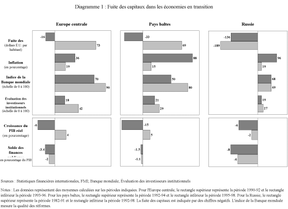 IV. PrivatisationComme indiqué plus haut, les économistes convenaient en général de la nécessité de procéder rapidement à la libéralisation et à la stabilisation des économies en transition. Toutefois, sur le front de la privatisation des grandes entreprises, les avis étaient partagés entre les tenants d'un transfert rapide des avoirs de l'État au secteur privé et ceux qui favorisaient une approche plus graduelle7. Les avocats d'une privatisation rapide préconisaient l'élimination de la propriété d'État par la redistribution (par exemple, au moyen de bons qui donneraient à leurs titulaires le droit et les moyens d'acheter les entreprises publiques mises en vente). Leur point de vue était motivé par un désir d'équité, leur souhait de permettre à tout un chacun d'avoir voix au chapitre. Ils percevaient en outre la nécessité de saisir l'occasion avant que l'appareil bureaucratique ne se ressaisisse pour résister au processus. Les partisans de l'autre camp préconisaient une réduction plus graduelle du secteur des entreprises publiques, à mesure qu'émergeraient de nouvelles entreprises privées. Ils étaient en faveur de la privatisation des entreprises par la vente de leurs actifs, de préférence à des personnes capables d'en améliorer le rendement. Ils insistaient sur l'importance d'imposer de strictes contraintes budgétaires pour éliminer les entreprises fonctionnant à perte et ne conserver que les entreprises rentables, capables d'attirer les investisseurs. La Hongrie a adopté cette approche graduelle, qui semble s'être révélée plus propice à une véritable restructuration des entreprises. Par contre, l'expérience a mis en lumière certains des pièges de la privatisation rapide. Dans la République tchèque, par exemple, les actifs de l'État ont été dispersés entre des millions de détenteurs ordinaires de bons, au cours de la première phase de la privatisation, mais ces titres ont été revendus pour se trouver en fin de compte concentrés aux mains des fonds d'investissement. Il n'y a pas eu de véritable restructuration des entreprises puisque ces fonds d'investissement manquaient des capitaux nécessaires pour les développer, où parce qu'ils étaient liés aux banques d'État qui n'imposaient pas de contraintes budgétaires rigoureuses. La croissance relativement faible de l'économie tchèque, par rapport à celles des autres pays d'Europe centrale et orientale, à la fin des années 90, est attribuable en partie à la faiblesse de la réforme des entreprises dans ce pays. La privatisation rapide a donné des résultats encore plus désastreux en Russie. Elle s'est traduite, de 1992 à 1994, par un transfert massif de la propriété de plus de 15.000 entreprises publiques à des intérêts privés. Cependant, contrairement à ce qu'on avait prévu, elle n'a pas conduit à une restructuration des entreprises imposée de l'intérieur. On avait espéré que les transactions sur le marché secondaire favoriseraient l'entrée d'investisseurs étrangers et que la seconde vague de privatisation visant le reste des entreprises d'État publiques utiliserait des méthodes transparentes, mais tel ne fut pas le cas. Les gens en place répugnaient à abandonner leur mainmise, les travailleurs craignaient les réductions de dépenses que pourraient imposer des investisseurs étrangers et les gestionnaires trouvaient plus facile de maintenir les entreprises à flot en exerçant des pressions sur l'État pour obtenir des subventions qu'en favorisant la compétitivité par la participation des investisseurs étrangers. La seconde vague de privatisations, et notamment le programme de prêts aux actionnaires, n'était pas transparente et excluait systématiquement les investisseurs extérieurs et les banques étrangères pour favoriser les intervenants entretenant des liens avec les autorités. Dans l'ensemble, l'expérience des économies en transition tend à démontrer que les entreprises privatisées se sont restructurées plus vite pour afficher de meilleurs résultats, en général, que les entreprises comparables qui sont restées publiques, mais seulement à certaines conditions complémentaires. Ces conditions comprenaient la mise en place de contraintes budgétaires et de conditions propices à la concurrence, de normes efficaces de bonne gestion, d'une structure juridique et de la protection des droits de propriété8. Contrairement aux résultats variables obtenus pour la privatisation des grandes entreprises, la privatisation des petites entreprises est pratiquement chose faite dans tous les pays sauf cinq. V. Mouvements de capitauxLe passage à l'économie de marché exigeait des financements considérables pour faciliter la réaffectation des investissements dans les secteurs productifs, moderniser des installations périmées, améliorer l'infrastructure publique et procurer les ressources financières voulues aux entreprises naissantes. Cependant, au cours des premières années de la transition, les pouvoirs publics des pays en transition ont eu du mal à obtenir les capitaux nécessaires. On n'a pas réussi à mettre sur pied, pour ces économies, un nouveau «Plan Marshall». Au lieu de cela, ces pays ont eu droit à une assistance beaucoup plus limitée, fournie principalement par les institutions financières internationales, l'Union européenne et certains pays bailleurs de fonds. Le problème de la rareté des capitaux a encore été exacerbé par la fuite des capitaux favorisée par les conditions incertaines qui régnaient au début de la transition. Toutefois, dès que les réformes ont été mises solidement sur les rails dans plusieurs pays d'Europe centrale et orientale et de la Baltique, les capitaux privés ont rapidement recommencé à affluer. Le diagramme 1 résume ce phénomène en comparant les estimations annuelles moyennes de la fuite des capitaux, du taux d'inflation, de la croissance du PIB réel, du solde d