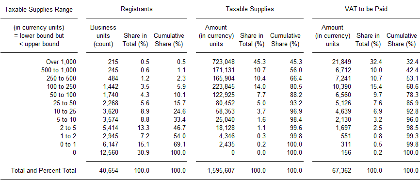 Some interpretations of the data can be made. For example, with a threshold set at 25 currency units (see under Taxable Supplies Range heading), 15.7 percent of all business establishments account for 93.2 percent of total taxable supplies and for 85.9 percent of VAT to be paid. Alternatively, with a threshold set at 5 currency units, 33.4 percent of all business establishments account for 98.4 percent of total taxable supplies and for 96.0 percent of VAT payable. An increase of about 10 percentage points (from 85.9 percent to 96.0 percent) in collections require that the tax administration move from handling 15.7 percent of the registrants to 33.4 percent of the registrants, more than a doubling of the number of firms. Summing the number of businesses from the top down to 50 currency units and then from the top to 5 currency units yields 6,394 and 13,588 firms respectively. The next step illustrates the trade-off even more sharply: reducing the threshold from 5 to 2 currency units adds a further 5,414 registrants but VAT to be paid increases to 98.5 percent of the total. Increasing collection by 1.5 percentage points (from 96.0 to 98.5) requires an almost 40 percent increase in the number of covered firms.