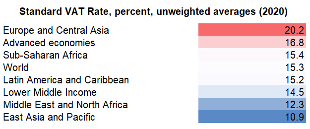 Noteworthy regional clustering effects are observed. Countries in Asia have the lowest average rates and include relatively new VATs. Middle East and North Africa and Latin America and the Caribbean have rates slightly lower than the world average. Advanced economies and countries in Europe have the highest standard rates and their averages exceed the world average. Newer VATs in Europe have been influenced by the EU experience with relatively high rates.