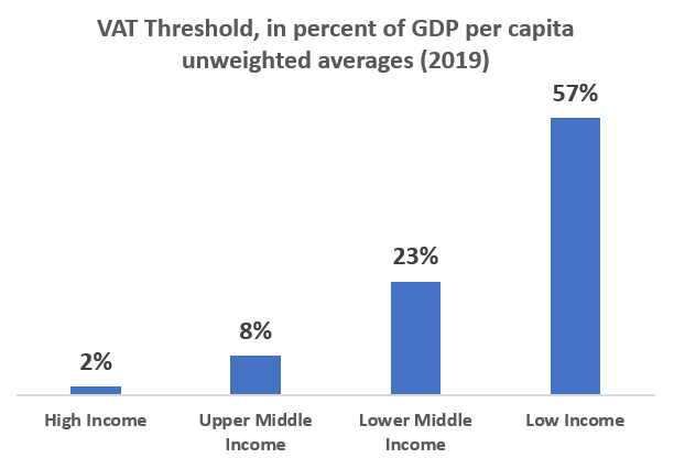 In practice, there is considerable variation in the level at which VAT thresholds are set. Amongst OECD countries, the UK has the highest threshold level (£85,000 annual turnover), whilst other countries, e.g., Chile or Spain, do not apply any threshold. The table below shows VAT thresholds in percent of GDP per capita for different income levels, aggregated based on average values. The question of the appropriate threshold level is explored separately under the Optimal VAT Threshold.
