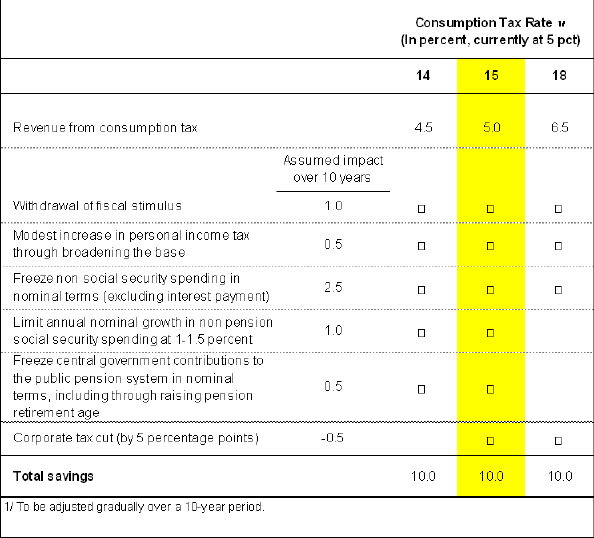 • Comprehensive tax reform. The key revenue measure would be a gradual increase in the consumption tax to 15 percent over several years, yielding 5 percent of GDP. To promote domestic investment, the corporate income tax rate, currently at 40 percent, could be lowered to 35 percent with revenue losses offset by reforms of personal income tax that reduce allowances and base exemptions.