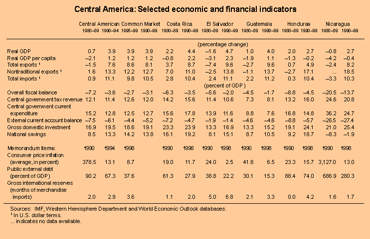 Average annual regional real GDP growth rose to almost 4 percent during the 1990s, with per capita output increasing at an average annual rate of 1.2 percent (compared with a decline of 2.1 percent during the previous decade) and most countries recording increases in saving and investment rates (see table above). There were significant differences among countries, however, with the more advanced economies (Costa Rica, El Salvador, and Guatemala) growing almost twice as fast as the poorer ones (Honduras and Nicaragua). Nicaragua began to recover only in 1994, after a period of hyperinflation and implementation of bold reforms that transformed its highly regulated economy into a market-based one (real GDP growth averaged 4� percent a year during the second half of the 1990s), while Honduras's weak performance could be traced to low factor productivity and the serious effects of Hurricane Mitch on the economy during 1998-99 (see box below).