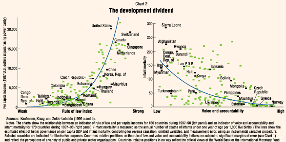 ![]() This imprecision indicates that running "horse races" between countries to determine their precise rankings on governance is not useful. It is more appropriate to simply group countries into three broad categories along various governance dimensions, using a "traffic light" approach. We also illustrate this approach in Chart 1, which presents selected countries in three broad categories: countries in "governance crisis" (in red), countries "at risk" (in yellow), and countries "not at risk" (in green). This broad categorical approach flags vulnerabilities and points to the need for reform without encouraging fruitless debate about the precise scores or rankings assigned to particular countries. Governance matters Does the imprecision of these aggregate indicators imply that they have limited value? Not at all. Although imprecise, they can identify the group of countries facing major governance challenges. Furthermore, they can be used to systematically assess the benefits of good governance for a large sample of countries. Not surprisingly, good governance is strongly correlated with better development. But we can go further than this obvious correlation, which might simply reflect the fact that richer countries are able to "afford the luxury of good governance"—as is argued by some of the practitioners of the worst governance in the world. In our research, we found a large causal effect running from improved governance to better development outcomes. An improvement of one standard deviation in the rule of law from the low level prevalent in Russia to the "middling" level in the Czech Republic or, alternatively, a reduction in corruption from the very high level prevalent in Indonesia to the lower level in Korea leads to between a two- and fourfold increase in per capita incomes, a decline in infant mortality of similar magnitude, and an improvement of 15-25 percentage points in literacy levels. Two examples of this "development dividend" are shown in Chart 2, which shows the beneficial impacts of improved citizen "voice" on infant mortality, for a sample of 173 countries, and of improved rule of law on per capita income, for a sample of 166 countries, using data for the late 1990s. These large causal effects suggest that good governance should be given a high priority on the development and poverty-reduction agendas.