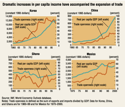 | In fact, there are no successful cases of fast-growing countries that followed inward-looking policies. Even so, not all open economies have prospered, nor have all citizens of countries that have globalized. Of course, other factors—including the full range of domestic economic and social policies—also shape countries' economic growth and how the benefits of that growth are shared.