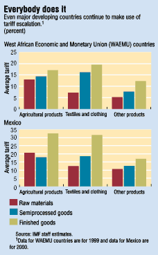Tariff structures of this sort are not limited to textiles. Another type of discriminatory tariff is tariff escalation—when tariffs increase with the degree of processing involved in the product. Cocoa beans are taxed at a lower rate than cocoa butter, which is taxed at a lower rate than chocolate. Tariff escalation is also seen in many major developing countries (see chart).
