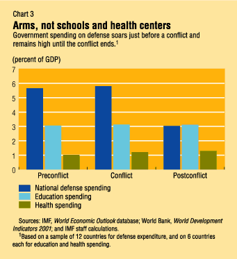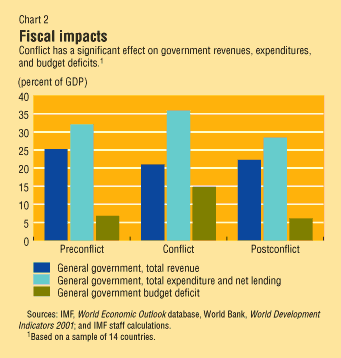However, little analysis has been done to show how conflict and terrorism affect macroeconomic performance and public finances either within or across a large number of countries. Our research is intended to fill this gap. We first assess the impact of armed conflict within countries by examining the evolution of macroeconomic and fiscal variables (such as growth, inflation, government revenues, expenditures, and budget balances) before (three years, on average), during, and after (three years, on average) 22 episodes in up to 20 conflict-afflicted countries between 1985 and 1999. Six of these are in Africa, three in Latin America, two each in Asia and the Middle East, and seven in Eastern Europe and the former Soviet Union. Then, to examine more rigorously the effects of conflict and terrorism, we econometrically estimate a system of interlinked equations covering a wider range of 45 countries, including those not affected by conflict and terrorism. Our findings confirm that armed conflict and terrorism hurt economic growth and public finances, raising important issues for policymakers. How countries are affectedArmed conflicts and terrorism can affect countries' fiscal accounts by disrupting economic activity, lowering the efficiency of tax administration, and affecting the composition of public spending in a manner that reduces growth. Military expenditures typically increase in response to conflict and terrorism and tend to remain high even after the violence ceases. Higher military spending can, in turn, reduce outlays for education, health care, and other productive activities. Moreover, the destruction of physical infrastructure, interruption of education and health services, and indirect effects on trade, tourism, and business confidence all weaken a country's fiscal position and hurt economic growth. Some have argued that defense spending can potentially spur growth by providing both internal and external security, thus boosting private savings and investment and attracting foreign investment. Most of the literature, however, shows that the majority of countries can encourage growth by decreasing military spending, which frees up resources for capital formation. Impact of past conflictsWhat impact has conflict had on growth? We find that GDP growth does indeed pick up significantly in the years immediately after a conflict ends. Inflation soars during conflicts and declines dramatically afterward (Chart 1; the sample size varies in the charts depending on data availability). Moreover, the share of gross fixed capital formation in GDP increases significantly immediately after a crisis ends.