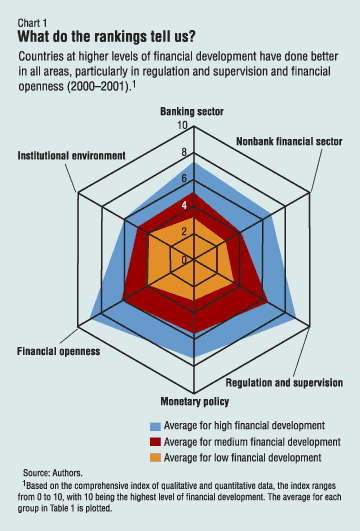 The MENA region ranked well below the industrial countries in financial development but above most other developing regions. However, it is interesting to note that, although the MENA region ranked well above the newly industrialized economies of East and Southeast Asia in the 1960s, it fell far behind in the 1980s and the 1990s. For MENA policymakers trying to compete in an increasingly globalized world, the challenge now is to concentrate efforts where financial development has been weakest, as suggested by our comprehensive index. This means less government interference in the financial system, which will require cutting back on public ownership of financial institutions and minimizing monetary financing of budget deficits, investing in human resources (including strong management and financial skills), and strengthening the legal environment. These measures will not only improve confidence but also facilitate greater investment and growth. References:David O. Beim and Charles W. Calomiris, 2001, Emerging Financial Markets (Boston: McGraw-Hill). Enrique A. Gelbard and Sergio Pereira Leite, 1999, "Measuring Financial Development in Sub-Saharan Africa," IMF Working Paper 99/105 (Washington). Mohsin S. Khan and Abdelhak S. Senhadji, 2000, "Financial Development and Economic Growth: An Overview," IMF Working Paper 00/209 (Washington). Ross Levine, 1997, "Financial Development and Economic Growth: Views and Agenda," Journal of Economic Literature, Vol. 35 (June), pp. 688–726. Karim Nashashibi, Mohamad Elhage, and Annalisa Fedelino, 2001, "Financial Liberalization in Arab Countries," in Macroeconomic Issues and Policies in the Middle East and North Africa, ed. by Zubair Iqbal (Washington: International Monetary Fund). Paul Wachtel, 2001, "Growth and Finance: What Do We Know and How Do We Know It?" International Finance, Vol. 4 (Winter), pp. 335–62.