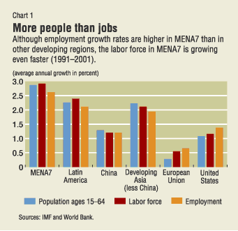 The bleak job picture is one of the region's most urgent and destabilizing problems, fueling social tensions and migration and making job creation a top priority. But policymakers face some difficult questions. Is it possible to increase the employment content of GDP growth, or will faster GDP growth be required—and, if the latter, how much faster? Will the current pattern of job creation—a large proportion of the region's workforce is employed by the public sector—need to change? An examination of the experiences of the MENA7 over the 1990s sheds some light on these and other questions. Together, these countries account for about 80 percent of the population and of the output of the region, excluding the GCC countries, whose economies and employment challenges differ from those of the rest of the region. Jobs lag population growthNew jobs were being created at a much faster rate in the MENA7 than in most other developing regions during the 1990s—over 2.6 percent a year. But the working-age population grew even faster, at a rate of 2.9 percent a year (Chart 1). This rate is expected to edge down but will do so only gradually, and demographic pressures will continue to weigh heavily on the region's labor markets.