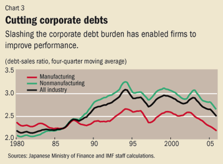 Ten years on The Japanese economy of today stands in sharp contrast with that of 10 years ago, especially in the banking and corporate sectors. Healthier banks. By end-September 2005, the ratio of nonperforming loans at major banks had fallen to below 2½ percent from a peak of 8½ percent in early 2002; the situation at regional banks improved as well, although more modestly. With banks having less need to make provisions against impaired assets and bad loans, their profitability also recovered, although it still remains low by international standards. On the whole, Japan's banks are now less vulnerable to shocks and better able to support economic activity. Whereas corporate restructuring and the economic recovery helped reduce the overhang of bad debts, heightened government efforts in supervision and other areas played a vital role in restoring the banking system to health. Stronger companies. Firms have largely succeeded in tackling the excesses of the 1990s by trimming costs, reducing unused capacity, and using increased profits to reduce their indebtedness. The focus has been on the following issues: