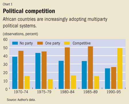Political reform and policy reform in contemporary Africa Development economists and political scientists point to a variety of factors to explain variations in growth in developing countries—among them geographic location, availability of natural resources, and the quality of political and economic institutions. They try to discover why one group of countries may have done well in the postcolonial period while others stagnated. Why, for instance, have the economic performances of Africa and Asia diverged so greatly when countries such as Ghana and Korea were at roughly similar levels of development in the 1960s? In the late 1970s and 1980s, a consensus emerged that the answer boiled down to differences in economic policies. To encourage development, international financial institutions began to advocate a combination of economic policy reform, coupled with institutional change to make governments answerable to the people and therefore more likely to follow policies that benefited the majority. The result was a shift from military and authoritarian regimes to multiparty systems, particularly in Africa. But improvements in economic policies did not necessarily follow. Indeed, the evidence suggests that while political competition reins in predatory governments, it may not encourage them to manage the economy better. In fact, the opposite may be true: governments subject to electoral risk may be less willing to adhere to macroeconomic (particularly fiscal) discipline. By introducing electoral competition, reformers may have stayed the hand of potential predators but also introduced politically driven budget cycles. Using Africa as a case study, this article looks at the extent and pattern of African political reform, examines how politicians may turn political accountability to their advantage, and suggests why institutional change alone may not be enough to improve economic policies. Impact of political change For a long time, economists believed that good policies would follow good governance. Citizens would choose governments that delivered economic performance and depose those that attempted to line their own pockets or those of special interest groups. Economic models provided support for this argument. In 1973, for example, Robert Barro showed that, in principle at least, institutions that render officeholders accountable can generate incentives that influence economic policy in the ways claimed by political reformers. More recently, a study we undertook (Humphreys and Bates, 2005) highlighted a second implication: the larger the decisive group of citizens—which we call the selectorate—the more inclined the government will be to furnish public rather than divisible goods in its effort to retain office. Intuitively, as the selectorate grows in size, the costs of "paying off" each member individually rise; it therefore becomes cheaper for the government to pay them off by financing a good that all can enjoy, such as a school or a hospital. In an attempt to put this theory about good policies into practice, local champions of political reform joined with international financial institutions to seek political change in low-income countries. In no place was this truer than in Africa, where political change came quickly, particularly between 1985 and 1995 (see Charts 1 and 2). The percentage of countries with multiparty systems rose dramatically, and the percentage of military governments declined (although less sharply).