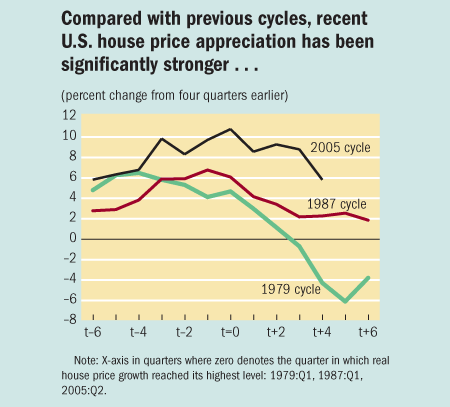 Previous housing market cycles in the United States have been associated with vastly different economic outcomes. In the 1979 cycle, real house prices fell, and consumption, residential investment, and GDP growth all slumped. Of course, economic conditions then were very different from those today: real interest rates were very high, as was the unemployment rate. The 1987 housing cycle was associated with a limited growth impact, and the IMF forecasts that the current housing cycle will do the same for 2007 growth. But there are downside risks. First, the slowing in house price appreciation could be more pronounced than expected—a drop in prices cannot be ruled out. Second, the wealth effects of slower house price growth on consumption may now be larger than in the past because of the greater exposure of households to asset price movements.