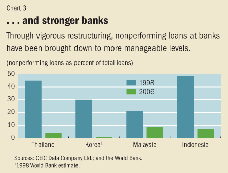 Fast-forward Today, Asia is among the star performers in the global economy. The region found strength in no small part by turning crisis into opportunity. The testing times of the late 1990s have rekindled a sense of regional identity and shared economic destiny. Regional policy forums have taken on renewed importance. Policy cooperation is gaining traction, and initiatives like the Chiang Mai network of bilateral swap lines among Asian central banks, which is now being converted into a reserve-pooling arrangement, and the Asian Bond Fund project provide a welcome measure of self-insurance and commonality of purpose. In addition, intraregional trade has grown rapidly, with the development of complex supply chains centered on China. At the same time, Asia has not turned its back to the outward-looking orientation that propelled its spectacular rise on the world's economic stage. Intraregional commerce is so far complementing—not substituting for—global trade. With deepening financial and trade connections inside and outside the region, Asia's economic vitality 10 years after the crisis stands out. The countries that were most affected by the crisis have made good progress in laying solid foundations for continued growth and their medium-term prospects are bright. What lies behind their success? The key to today's dynamism has been nimbler macroeconomic policy frameworks and comprehensive reforms in the financial and corporate sectors. More flexible exchange rate regimes have cushioned external shocks and an impressive war chest of official reserves has been built up; inflation targeting has provided a monetary anchor in many cases; and fiscal policies have taken on a longer-term perspective to safeguard debt sustainability. As for structural reforms, measures to deal with the immediate strains in the financial system have been complemented by steps to address the underlying weaknesses. Mechanisms to facilitate financial restructuring are now in place, regulatory and prudential frameworks have been upgraded, and corporate governance has been strengthened. More work lies ahead, but financial institutions and corporates in Southeast Asia have, on the whole, regained a solid footing (see Charts 2 and 3).
