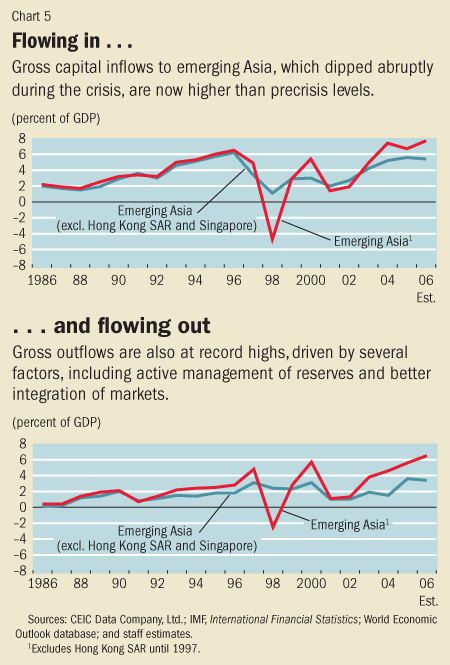 The causes of Asia's growing disparities are complex. Several factors may be at play, but skill-biased technical progress in the more advanced economies and the transition from agriculture to industry in developing ones appear to be the main forces shaping income distribution in the region. Globalization is of course providing the broader context for the changes in technology and patterns of production that are at the root of differential wage and sectoral developments. Besides ethical or social implications, worsening inequality is a concern for economic policymakers. If unattended, growing disparities could strain social cohesion and undermine the support for further engagement in the global economy, in spite of great potential benefits. More broadly, tears in the social fabric could lead to inferior economic outcomes—namely, lower long-term growth, macroeconomic instability, and dwindling room for maneuver when adverse shocks occur. Asian policymakers are looking for ways to stem the trend. Specific measures depend on individual country circumstances, but in all cases need to be supported by sound macroeconomic management, which is necessary for sustainable growth. Growth holds out the greatest promise for lifting the poor out of poverty and providing better opportunities to the disadvantaged. Policy options to address inequality more directly include greater and more effective spending on education and infrastructure to build human capital and enhance the allocation of resources; labor market reforms that facilitate hiring and improve the employment conditions of nonregular workers; more equal access to financial markets to empower the poor and improve economic efficiency; and regulatory reforms to bolster the investment climate. Because the old tend to be poorer, steps to better absorb the fiscal impact of rapid population aging will also help redress income and geographical disparities in several countries. Unstable capital flows. The other big challenge facing Asia relates to the ongoing integration of its capital market, both within the region and globally. The region's large current account surplus continues to be the main reason for its overall balance of payments surplus. But, whereas net inflows to emerging Asia remain close to their long-run average relative to aggregate GDP, gross capital inflows and outflows are at record highs (see Chart 5). Capital is pouring in because of ample global liquidity and an expanded international investor base. It is being attracted by improved fundamentals, favorable interest rate differentials on domestic assets (especially against the yen), and broader and deeper regional financial integration. Savings have also been flowing out of the region as never before. Active official reserve management in some cases, more relaxed restrictions on residents' investment abroad in others, and—throughout the region—better integration of markets and production structures have provided powerful drivers for gross outflows.