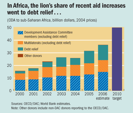 Exacerbating matters, of the aid that was given, debt-relief grants totaled one-fifth of total ODA during 2005–06, dominated by Paris Club settlements with Iraq and Nigeria. In sub-Saharan Africa, debt relief took one-third of ODA, raising additional questions about whether donor countries will be able to meet and sustain their promised doubling of aid as debt relief fades out.