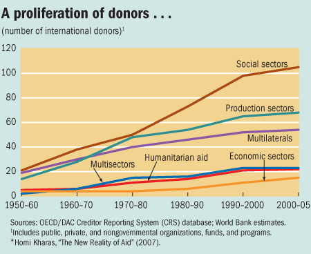 Over a longer period, the number of aid channels in the development arena has soared—from 65 in 1950–60 to 287 in 2000–05. Many new donors have announced ambitious plans to scale up their engagement in the aid arena, and private organizations, in particular, have rapidly expanded their activities. While statistics are notoriously incomplete, estimates of private philanthropy directed to developing countries are as high as $60 billion, of which about half comes from the United States—whose contribution has increased over fourfold since 1990.*
