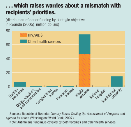 In Rwanda, although malaria is the leading cause of morbidity and mortality, donor funds allocated to antimalaria activities were only about one-third the amount allocated to combating HIV/AIDS. Moreover, 75 percent of donor support went directly to nongovernmental organizations or was directly managed by the donors through their own projects, greatly constraining the government's ability to channel ODA to program priorities.