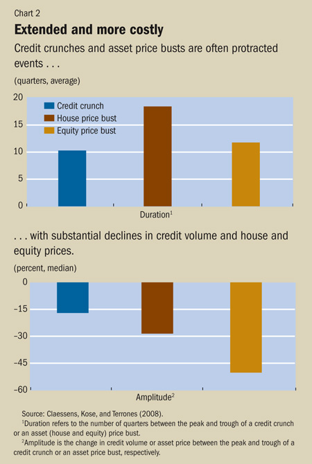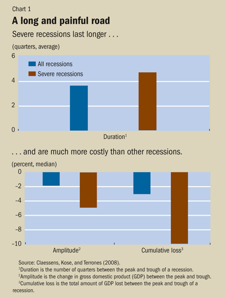 Recessions accompanied by credit crunches or asset price busts are deeper and longer lasting The financial turmoil that started in the United States has already affected the real economy in countries around the globe. But how severe the impact will be and how prolonged the resulting recession is a matter of intense debate among economists. This debate has highlighted a number of questions about the linkages between the financial sector and the real economy during recessions. For example, how do macroeconomic and financial variables behave during recessions, credit crunches, and asset (house and equity) price busts? And are recessions associated with credit crunches and asset price busts different from other recessions? To shed light on these questions, we undertook a comprehensive analysis of the linkages between key macroeconomic and financial variables around business and financial cycles for 21 Organization for Economic Cooperation and Development countries between 1960 and 2007 (Claessens, Kose, and Terrones, 2008). This is the first detailed, cross-country empirical study addressing the implications of recessions when they coincide with financial market difficulties, including credit crunches, house price busts, and equity price busts. Recessions, crunches, and busts There have been 122 recessions between 1960 and 2007. Recessions on average lasted about four quarters, with substantial variation across episodes—the shortest was 2 quarters and the longest 13 quarters (see Chart 1). The typical decline in output from its peak to its trough—the recession’s amplitude—tended to be about 2 percent. We also computed a measure of cumulative loss that combined information about both the duration and amplitude of a recession to estimate its overall cost. The cumulative loss from a recession was typically about 3 percent. Severe recessions—those in which the peak-to-trough decline in output was in the top quartile of all recession-related output declines—were more than three months longer than the average recession and much more costly.