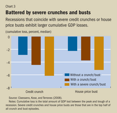 If they were not followed by recessions, the episodes of crunches and busts were not necessarily associated with declines in output. In fact, although output growth slowed—especially during the early stages of credit crunches and house price busts—it often expanded at the end of these episodes. The eventual increase in output during crunches and busts is not surprising, because these episodes did not always fully overlap with recessions and lasted twice as long as the recessions. Still, the average growth rate of output during crunches and busts was much lower than during more tranquil periods in credit and housing markets. Both credit crunches and house price busts were, however, associated with significant declines in investment. Credit crunches tended to coincide with a decline in residential investment of about 6 percent, whereas house price busts were accompanied by about twice as large a drop. The unemployment rate increased significantly, especially during the early stages of these episodes, as economic activity started to soften. Cycles move in step across countries Just as many countries experience synchronized recessions, countries also go through simultaneous episodes of credit contraction. Moreover, declines in house and equity prices tend to occur at the same time. For example, house price declines are highly synchronized across countries—reflecting the importance of global financial factors, including common movements in national interest rates, in driving house price fluctuations. Equity prices exhibit the highest degree of synchronization, likely because of the high financial integration of equity markets. But the number of countries experiencing bear equity markets frequently exceeds the number experiencing a recession. As the popular saying goes, "Wall Street has predicted nine of the last five recessions." Double whammy Many recessions were indeed associated with credit crunches or asset price busts. In one out of six recessions, there was also a credit crunch under way, and in one out of four recessions a house price bust. Equity price busts overlapped for one-third of recession episodes. There can also be considerable lags between financial market disturbances and real activity. A recession, if one occurs, can start as late as four to five quarters after the onset of a credit crunch or housing bust. One of the key questions surrounding the current financial crisis is whether recessions associated with crunches and busts are worse than other recessions. Here, the international evidence is clear: these types of recessions are not only longer, but also are associated with much greater output losses than others. In particular, although recessions accompanied by severe credit crunches or house price busts last only three months longer on average, they typically result in output losses two to three times greater than recessions without such financial stresses (see Chart 3).