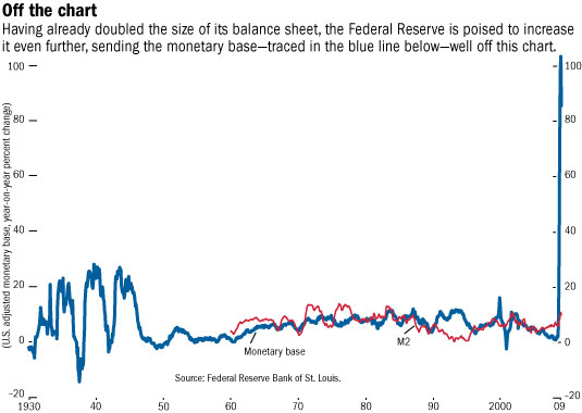 Having already doubled the size of its balance sheet, the Fed is now poised to increase it even further, sending the monetary base (the blue line) well into another page on top of this one. In March 2009, the Fed announced that it would massively increase its purchases of mortgage-backed securities and debt issued by U.S. housing agencies Fannie Mae and Freddie Mac, and start to buy long-term U.S. Treasury bonds. These purchases have already begun but could go much further.