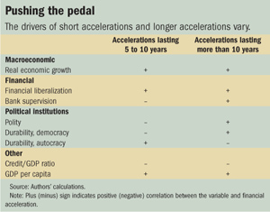 We found that the determinants of financial acceleration vary between short and long episodes. Favorable macroeconomic conditions increase the likelihood of all types of acceleration. The same is true for financial liberalization. When a country takes measures to liberalize its financial system, it has a significant and large impact on the probability of all types of acceleration.