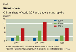 as well as closer correlation of market sentiment in China and the rest of Asia and, more recently, the world. China’s share in world trade has increased nearly tenfold over the past three decades, to about 9 percent, while its share in world GDP has risen to 13 percent from less than 3 percent (purchasing-power-parity basis; see Chart 1).