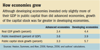 On average, GDP grew by 3.4 percent in advanced economies and 4.4 percent—1 percentage point more—in developing economies from 1960 to 2000 (see table). Despite the higher growth in developing economies, the average public investment rates in advanced and developing economies were similar during this period. In particular, average public investment was 3.6 percent of GDP for advanced economies and 3.9 percent for developing economies. Although the investment rates were similar, the capital stock itself grew almost twice as fast in developing economies as in advanced economies during 1960–2000, because much of the investment in advanced economies replaced worn-out capital stock. This difference in capital stock accumulation helps explain much of the long-term growth differential across countries.