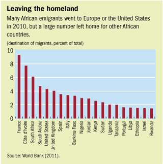 Using a narrow but convenient definition of diaspora as “foreign-born population,” the total diaspora from African nations was 30.6 million in 2010 (World Bank, 2011). About half left for another country in Africa. Europe was the primary destination for the rest (see chart).