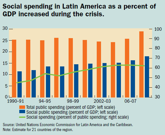 The main reasons for the reduction in poverty are strong economic growth, higher wage earnings, a decline in fertility rates, and better social programs. Efforts to reduce the effects on the poor during the 2008–09 economic crisis led to large increases in social expenditure and spending on public education. Total public spending increased by 3 percent of GDP during 2008–09 compared with 2006–07, and social spending increased by 2 percent of GDP over the same period. In the countries where social expenditure is less than $300 per person, the main expense is education. It is only in the relatively more developed countries (per capita social spending over $1,000) that social security and assistance account for more. But social protection systems are still far from inclusive, and large gaps remain—especially in access to social security.