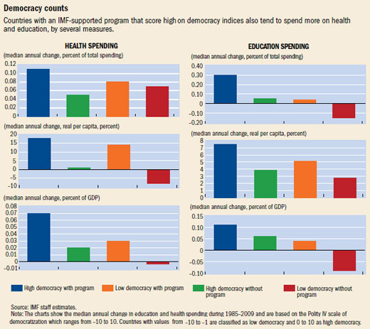 We also assessed the effect of scores on democracy in our econometric model, using a formulation similar to that of the 2006 paper of Professors Nooruddin and Simmons that interacts the presence of an IMF program with an index score for democracy. The effect was statistically insignificant for education and health spending as a share of GDP and a share of government spending, except for the effect on health as a share of GDP, where it was positive. Thus, our analysis does not suggest that IMF-supported programs lead to lower increases in spending under democracies.