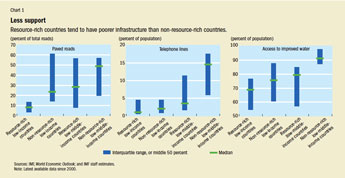 The fundamental goal of resource-rich economies should be to transform their exhaustible natural resources into assets—human, domestic, and private capital and foreign financial assets—that will generate future income and support sustained development. But the record is mixed. Several of these countries lack such basic infrastructure as roads, railways, ports, and electricity as a result of insufficient and inefficient investment spending (see Chart 1). And a number of resource-rich countries have saved relatively little of the income from their natural resources and, after adjusting for the depletion of these resources, may indeed have negative net saving rates. Partly as a result of low savings, investment, and growth, many resource-rich developing countries face endemic poverty. Indeed, they often do less well than non-resource-rich developing countries when assessed against standard poverty and other social indicators (see Chart 2).