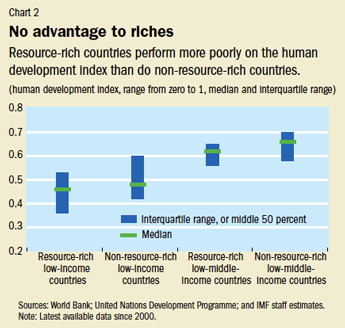 Various arguments have been made to explain the disappointing performance in some countries with abundant natural wealth. One is that the natural resource sector chokes off other export sectors by driving up prices and undermining competitiveness (this is known as the Dutch disease effect; see “Dutch Disease: Wealth Managed Unwisely,” in F&D’s compilation of Back to Basics columns—www.imf.org/basics). Another is that the economy’s exposure to volatile prices exacerbates the difficulties of economic policymaking. Yet another explanation is that easy money from the natural resource sector creates governance challenges and could contribute to weak institutions, a risk of conflicts, and an adverse investment climate.