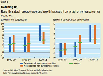 Recently, however, the growth rate of natural resource exporters in the developing world has caught up with that of their non-resource-rich counterparts, reflecting the boom in commodity prices, new discoveries, and improved economic policies (see Chart 3).