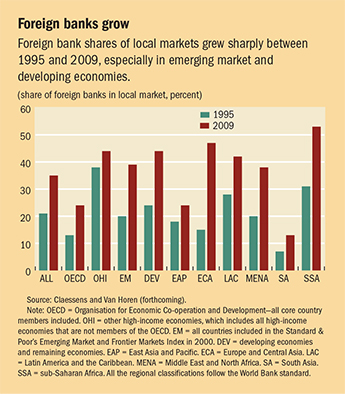 Similarly there was a large increase in the local presence of foreign banks and other financial institutions prior to the crisis. In the preceding two decades, banks enlarged their global footprint by establishing operations in many countries through branches (direct extensions of the bank) and subsidiaries (which are locally chartered and capitalized). Over the period 1995–2009, some 560 foreign bank investments took place, increasing the average number of foreign banks from 20 percent of total banks operating in local markets to 34 percent (see chart). With a local charter and physical presence, banks can raise funds locally and lend to host country firms and households more easily; they can also use capital from their parent bank or fund themselves in international capital markets. Being closer to the final customer offers important advantages to banks and other providers of financial services—notably, a better assessment of growth opportunities and risks.