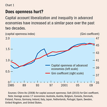 The past three decades have been associated with a steady decline in the number of restrictions that countries impose on cross-border financial transactions, as reported in the IMF’s Annual Report on Exchange Arrangements and Exchange Restrictions. An index of capital account openness constructed from these reports shows a solid increase—that is, restrictions on cross-border transactions have been steadily lifted. At the same time, there has been an increase in income inequality in advanced economies—as measured by the Gini coefficient, which takes the value zero if all income is equally shared within a country and 100 (or 1) if one person has all the income (see Chart 1).