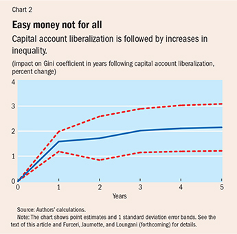 What happens to inequality in the aftermath of these episodes? The evidence is that, on average, capital account liberalization is followed by a significant and persistent increase in inequality. The Gini coefficient increases by about 1 percent a year after liberalization and by 2 percent after five years (see Chart 2).