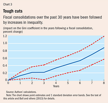 There is clear evidence that the decline in budget deficits was followed by increases in inequality. The Gini coefficient increased by 0.2 percentage point two years following the fiscal consolidation and by nearly 1 percentage point after eight years (Chart 3).