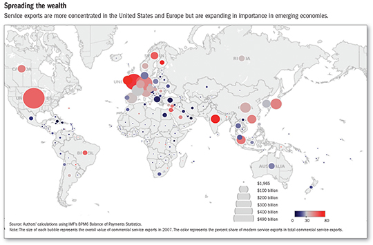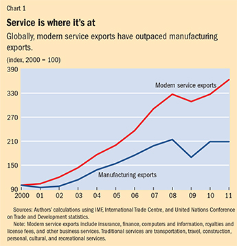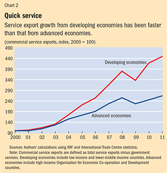The unbundling of services has opened up niches that can be exploited by developing economies (the term is used in this article to refer to both emerging markets and low-income countries) as well as advanced economies (see map). Though measuring services trade is difficult, it appears that developing economies’ share in world service exports increased from about 14 percent in 1990 to 25 percent in 2011. And even though it is measured from a much lower base, service export growth has exceeded that from advanced economies (see Chart 2).
