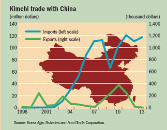 On the other hand, Korea’s kimchi exports to China, which peaked in 2010 at $378,000, dropped to $15,000 in 2012 and to almost zero last year as a result of measures by the Chinese government to protect domestic producers.