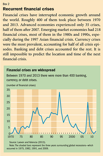 But the global growth process itself has never been smooth. Many countries experienced financial crises that led to significant declines in their growth during the past half century (see Box 2). The global economy also went through periods of severe interruptions in growth. In every decade after the 1960s, there was a global recession (see Chart 6). In 1975, 1982, 1991, and 2009, world per capita output declined and various other measures of global activity fell simultaneously (Kose and Terrones, forthcoming).