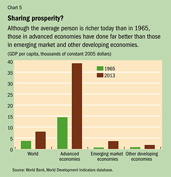 The world economy is six times larger than it was half a century ago, growing at an annual rate of 4 percent during the period. New technologies have paved the way for more efficient production systems in a wide range of industries and promoted economic growth. From 1965 to 2013, the average annual growth rate of world GDP per capita was about 2 percent, and in more than half of the past 50 years, the world grew faster than this average. As a result, global per capita GDP more than doubled between 1965 and 2013 despite a major increase in population (see Chart 5).
