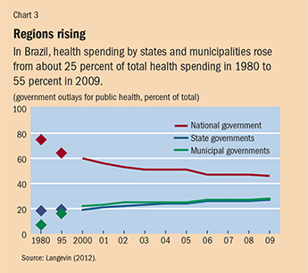 Yet much public spending for health does not take place at the national level—particularly in large federal countries with self-governing regional entities such as states and provinces (see Chart 2). Many tough decisions on how to allocate public health funds efficiently and effectively are made not in a capital city but by regional and local governments. In advanced economies this is nothing new. As incomes rise in emerging market and developing economies and as they continue to democratize, decentralize, and urbanize, spending by subnational governments will likely continue to grow. In Brazil, for example, subnational spending on health rose from 25 percent to 55 percent of total public health spending between 1980 and 2009 (see Chart 3).