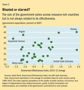 Another effect of direct distribution would undoubtedly be smaller government. Shifting resources to the private sector could curtail wasteful spending in some resource-rich countries but in others it could lower public spending to the point of threatening necessary infrastructure and public goods. Total expenditure in resource-rich countries averages about 28 percent of GDP, which seems broadly in line with that in non-resource-rich economies. But there are significant differences in government size and institutional capacity across resource-rich countries (see Chart 2). The likely impact on income distribution and provision of public services only reinforces the need to start small when it comes to direct distribution.