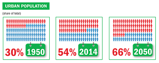 Today, over half of the world’s population lives in cities. By 2050, this proportion is estimated to grow to 66 percent, according to a new report from the United Nations. Just three countries—India, China, and Nigeria—are expected to account for 37 percent of the projected growth of the world’s urban population between 2014 and 2050.