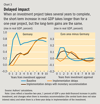 These results assume that infrastructure projects are approved, built, and operational within the very tight time frame of one year. In a more realistic case of implementation delays—in which a project is approved in the first year, but spending continues over three years and the infrastructure becomes active in the fourth year—the eventual rise in real GDP is postponed (see Chart 3). Because of the lagged completion (and the delayed productivity benefits for the economy), increases in private investment and employment also stall. Domestic output could contract for a while, with some adverse regional spillovers. Nevertheless, the longer-term output gains characterized by higher public investment are the same. A by-product of implementation delays is deferred and somewhat smoother deficit spending, which implies less of an annual budgetary burden in the short run.