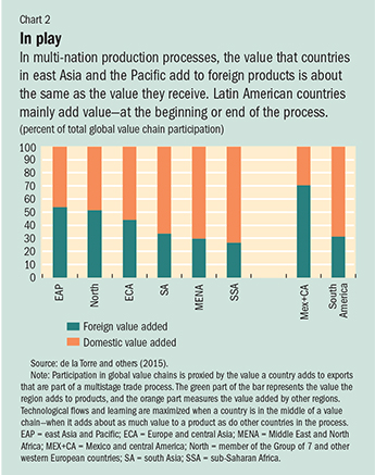 It is in intra-industry trade and participation in global value chains that economies in Latin America lag. Despite the region’s good connections to regional and more distant trading partners, its degree of intra-industry trade, captured by an index ranging from zero to 1, was only about 0.25 in 2011 (de la Torre and others, 2015). This contrasts with 0.35 among east Asian and Pacific countries. Furthermore, although for the past two and a half decades Latin American countries have increased their participation in global value chains much faster than countries from other regions, they still are well behind east Asian countries. In east Asia nearly 50 percent of exports were part of value chains in 2011; in Latin America it was close to 40 percent.