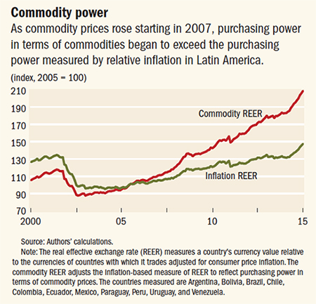 To construct an index that reflects an economy’s purchasing power, its REER can be adjusted to yield the commodity terms of trade real effective exchange rate. The weighted consumer price indices in the REER are replaced by the trade-weighted commodity terms of trade of each country. The terms of trade measure is a country’s export prices divided by import prices. When commodity prices increase, the commodity REER increases more than the standard REER, and vice versa. The chart shows how the two measures of purchasing power compare in Mexico and South America from 2000 to 2015.