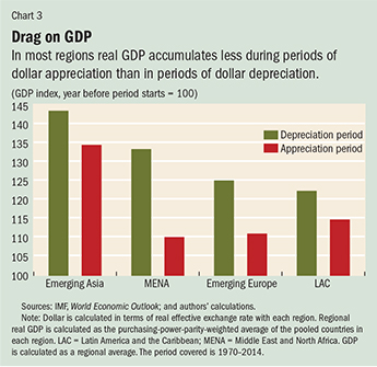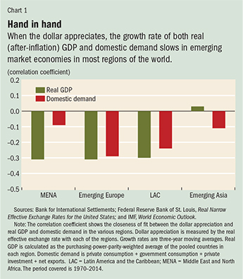 Based on data for 1970–2014 we found that during periods of dollar appreciation—which are about six to eight years long and usually occur when the U.S. economy is growing—real GDP growth in emerging markets slows, even though U.S. growth is driving global demand. By contrast, during periods of a depreciating dollar—which last about nine years—emerging market economies do better.