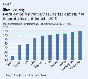 Moreover, the share of older people in the population is growing, while the share of working-age (15–64) people is shrinking. Because the propensity to join the workforce typically begins to erode after age 50, the average labor force participation rate is declining. At the same time, the capital stock is expected to grow slowly. The capital stock expands when new investment outpaces the rate at which that stock wears out (depreciation). This hasn’t been the case in the euro area, where business investment has expanded moderately since 2013, and reached its 2008 level only in 2015 (see Chart 2). In other words, the euro area continues to suffer from too few workers and too little investment.