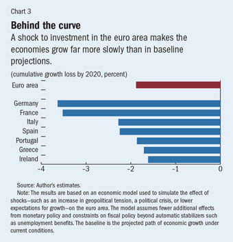 These results highlight the vulnerability of the euro area to lower growth. By 2020 the euro area output level would be nearly 2 percent lower than the baseline projection. As a result, it would take three to four more years (relative to the baseline projection) for economic output to reach its full potential. Borrowing costs would increase, especially in Greece, Ireland, Italy, Portugal, and Spain. The unemployment rate and public-debt-to-GDP ratios would also increase. Inflation rates would be lower, pushing the euro area closer to deflation in the near term (see Chart 3).